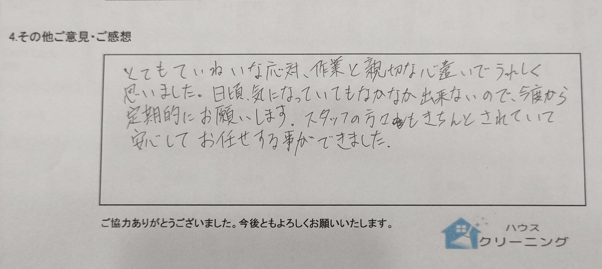 とても丁寧な対応、作業と親切な心遣いでうれしく思いました。日頃、気になっていてもなかなか出来ないので、今度から定期的にお願いします。スタッフの方々もきちんとされていて、安心してお任せする事ができました。